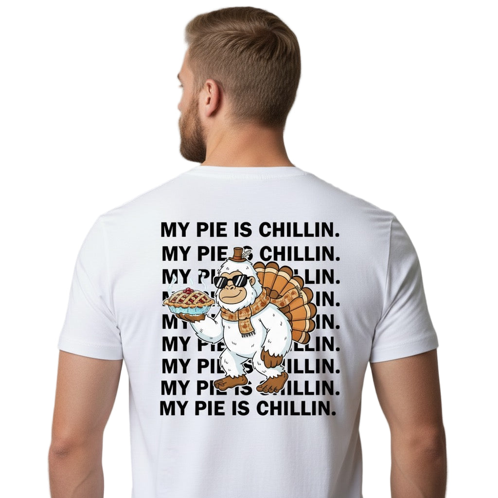✨ Details: • Premium soft cotton for all-day comfort • Front emblem of Frosty the Yeti holding his famous pie • Full back print featuring the bold phrase: “MY PIE IS CHILLIN.” • Unisex relaxed fit • Available in multiple sizes and colors